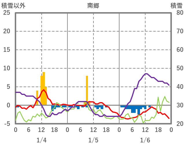 | 日 | 時 | 気温 | 降水 | 風向/風速 | 日照 | 積雪 | 降雪 |