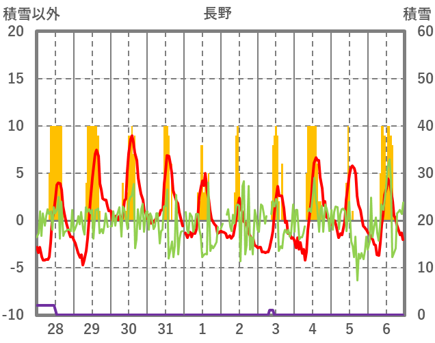 | 日 | 時 | 気温 | 降水 | 風向/風速 | 日照 | 積雪 | 降雪 |