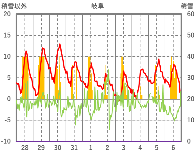| 日 | 時 | 気温 | 降水 | 風向/風速 | 日照 | 積雪 | 降雪 |