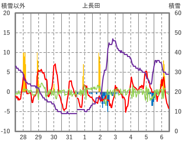 | 日 | 時 | 気温 | 降水 | 風向/風速 | 日照 | 積雪 | 降雪 |