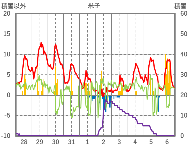 | 日 | 時 | 気温 | 降水 | 風向/風速 | 日照 | 積雪 | 降雪 |