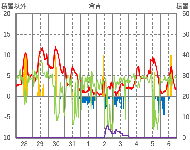 | 日 | 時 | 気温 | 降水 | 風向/風速 | 日照 | 積雪 | 降雪 |