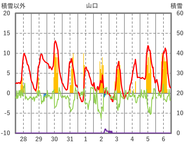 | 日 | 時 | 気温 | 降水 | 風向/風速 | 日照 | 積雪 | 降雪 |