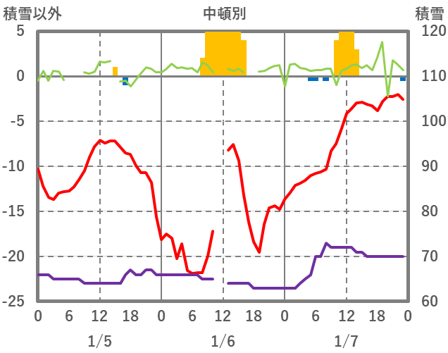 | 日 | 時 | 気温 | 降水 | 風向/風速 | 日照 | 積雪 | 降雪 |