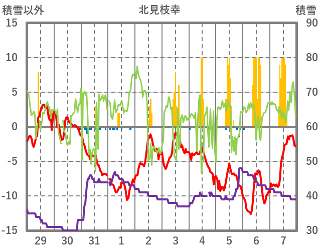 | 日 | 時 | 気温 | 降水 | 風向/風速 | 日照 | 積雪 | 降雪 |