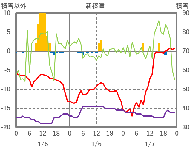 | 日 | 時 | 気温 | 降水 | 風向/風速 | 日照 | 積雪 | 降雪 |