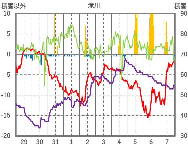 | 日 | 時 | 気温 | 降水 | 風向/風速 | 日照 | 積雪 | 降雪 |