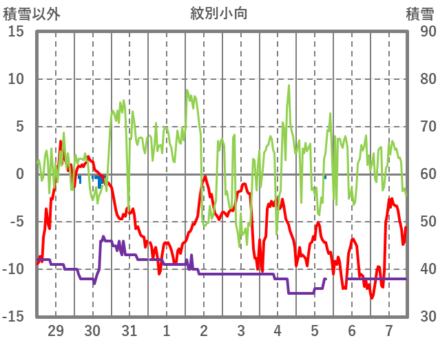 | 日 | 時 | 気温 | 降水 | 風向/風速 | 日照 | 積雪 | 降雪 |