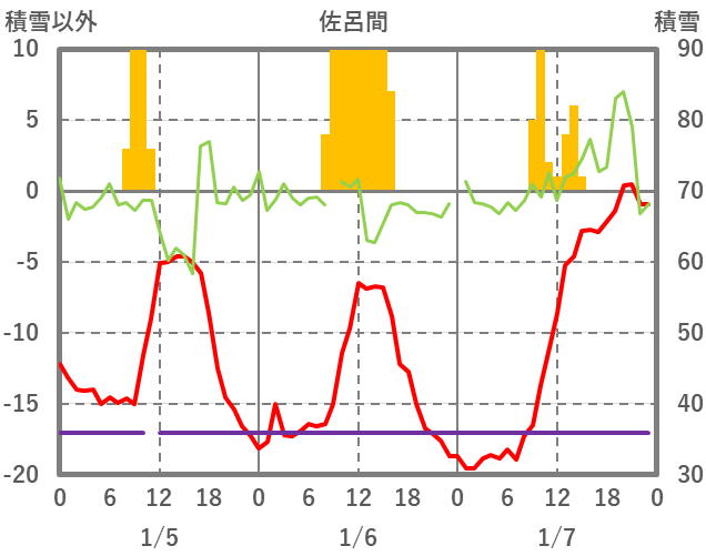 | 日 | 時 | 気温 | 降水 | 風向/風速 | 日照 | 積雪 | 降雪 |