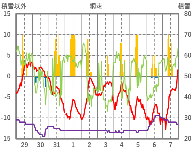 | 日 | 時 | 気温 | 降水 | 風向/風速 | 日照 | 積雪 | 降雪 |