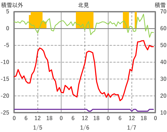 | 日 | 時 | 気温 | 降水 | 風向/風速 | 日照 | 積雪 | 降雪 |