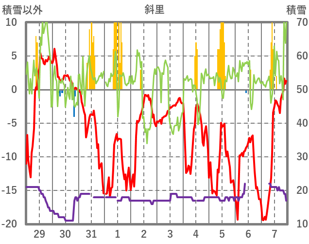 | 日 | 時 | 気温 | 降水 | 風向/風速 | 日照 | 積雪 | 降雪 |