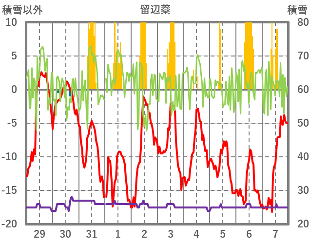 | 日 | 時 | 気温 | 降水 | 風向/風速 | 日照 | 積雪 | 降雪 |