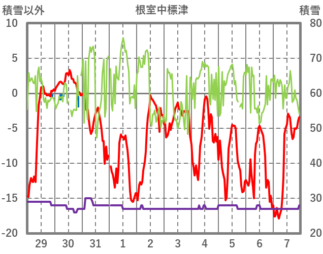 | 日 | 時 | 気温 | 降水 | 風向/風速 | 日照 | 積雪 | 降雪 |