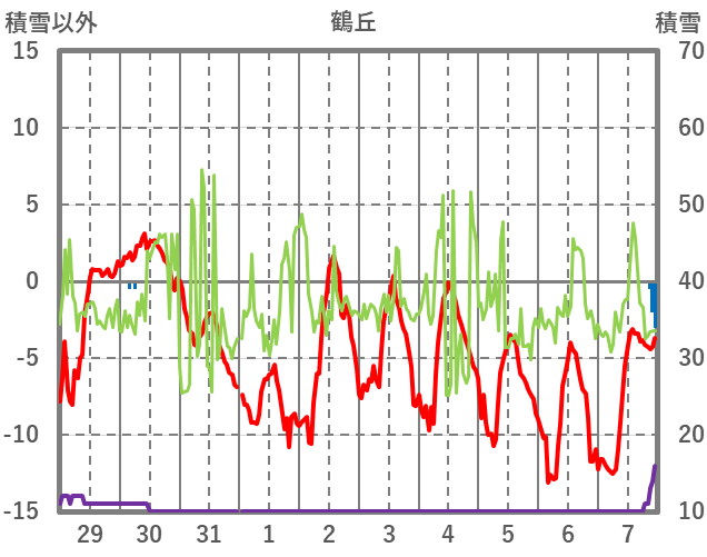 | 日 | 時 | 気温 | 降水 | 風向/風速 | 日照 | 積雪 | 降雪 |