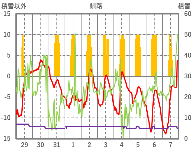 | 日 | 時 | 気温 | 降水 | 風向/風速 | 日照 | 積雪 | 降雪 |