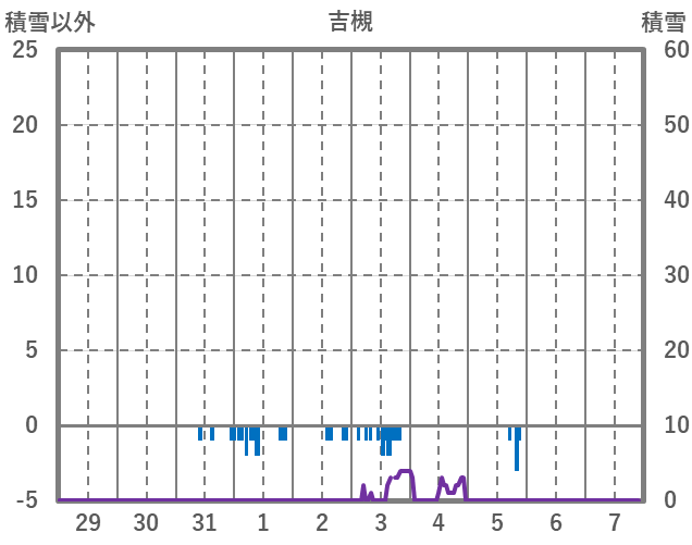 | 日 | 時 | 気温 | 降水 | 風向/風速 | 日照 | 積雪 | 降雪 |