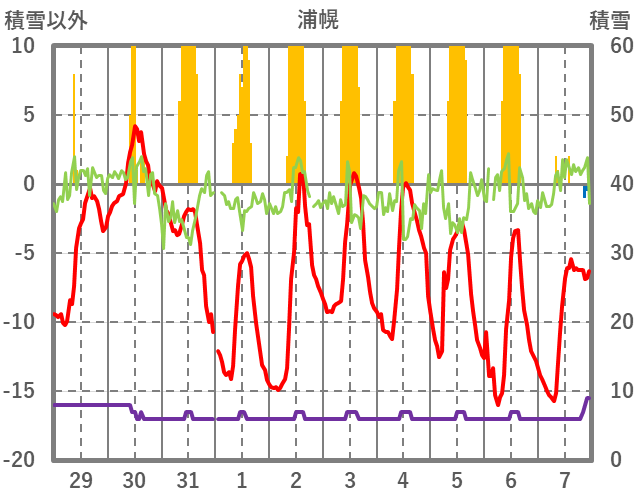 | 日 | 時 | 気温 | 降水 | 風向/風速 | 日照 | 積雪 | 降雪 |