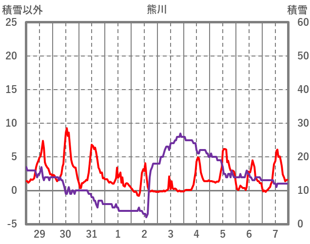 | 日 | 時 | 気温 | 降水 | 風向/風速 | 日照 | 積雪 | 降雪 |
