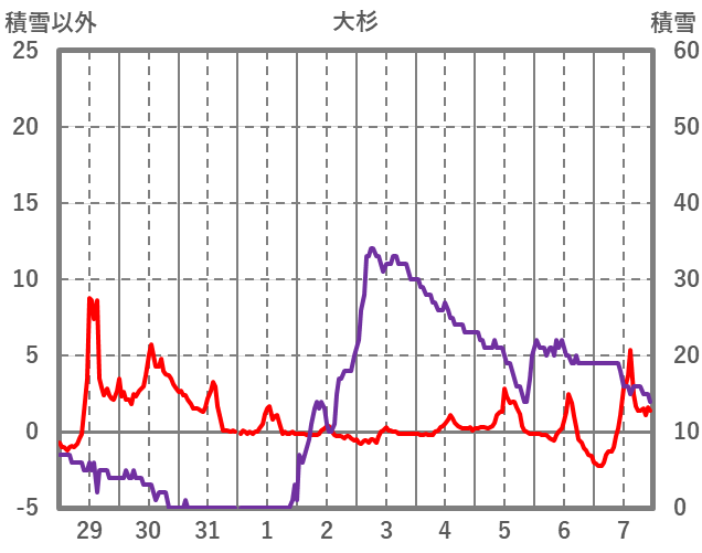 | 日 | 時 | 気温 | 降水 | 風向/風速 | 日照 | 積雪 | 降雪 |