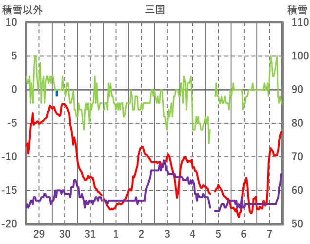 | 日 | 時 | 気温 | 降水 | 風向/風速 | 日照 | 積雪 | 降雪 |