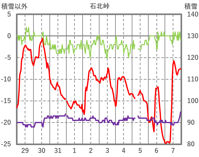 | 日 | 時 | 気温 | 降水 | 風向/風速 | 日照 | 積雪 | 降雪 |
