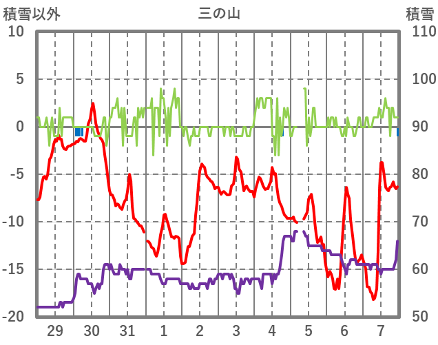 | 日 | 時 | 気温 | 降水 | 風向/風速 | 日照 | 積雪 | 降雪 |