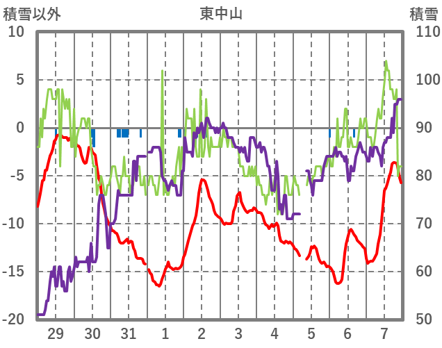 | 日 | 時 | 気温 | 降水 | 風向/風速 | 日照 | 積雪 | 降雪 |