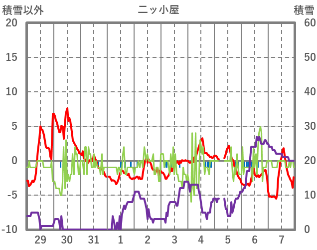 | 日 | 時 | 気温 | 降水 | 風向/風速 | 日照 | 積雪 | 降雪 |