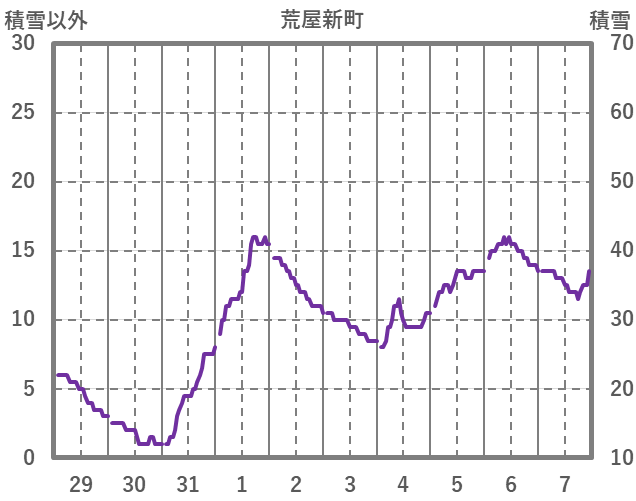 | 日 | 時 | 気温 | 降水 | 風向/風速 | 日照 | 積雪 | 降雪 |