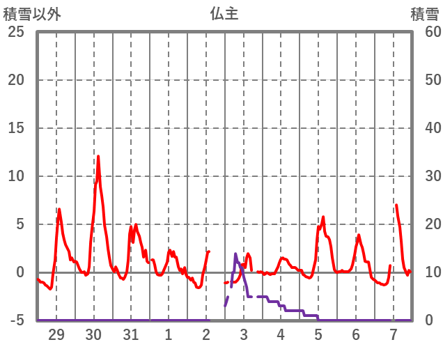 | 日 | 時 | 気温 | 降水 | 風向/風速 | 日照 | 積雪 | 降雪 |
