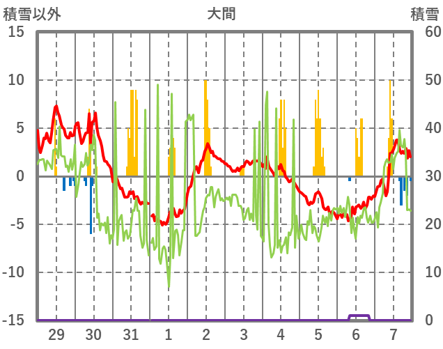 | 日 | 時 | 気温 | 降水 | 風向/風速 | 日照 | 積雪 | 降雪 |