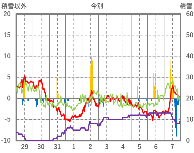 | 日 | 時 | 気温 | 降水 | 風向/風速 | 日照 | 積雪 | 降雪 |