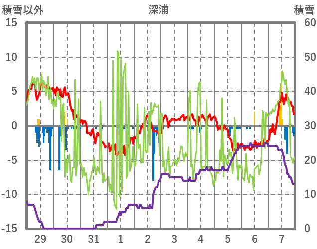 | 日 | 時 | 気温 | 降水 | 風向/風速 | 日照 | 積雪 | 降雪 |