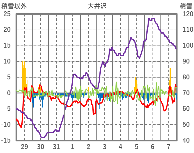 | 日 | 時 | 気温 | 降水 | 風向/風速 | 日照 | 積雪 | 降雪 |
