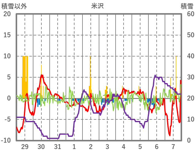 | 日 | 時 | 気温 | 降水 | 風向/風速 | 日照 | 積雪 | 降雪 |