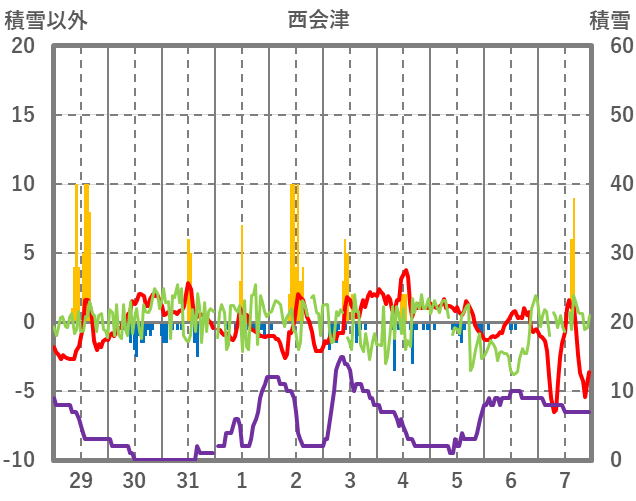 | 日 | 時 | 気温 | 降水 | 風向/風速 | 日照 | 積雪 | 降雪 |