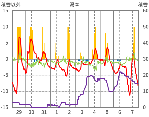 | 日 | 時 | 気温 | 降水 | 風向/風速 | 日照 | 積雪 | 降雪 |
