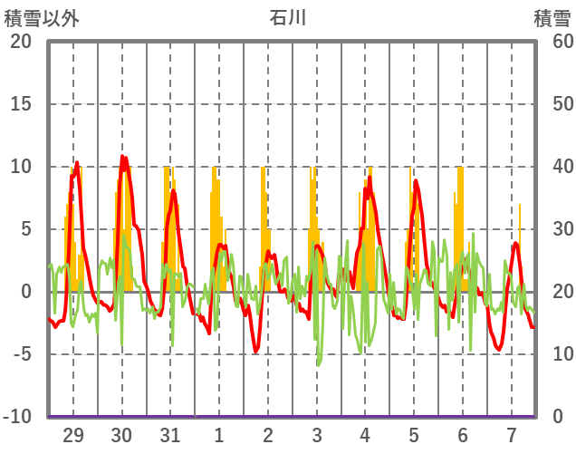| 日 | 時 | 気温 | 降水 | 風向/風速 | 日照 | 積雪 | 降雪 |