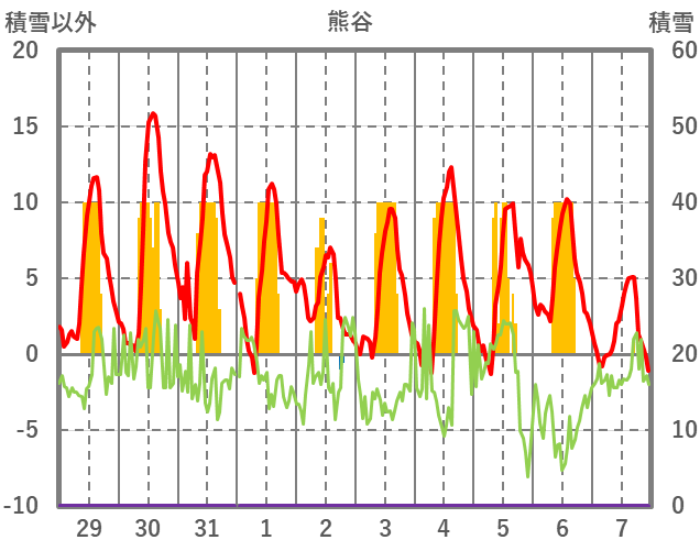 | 日 | 時 | 気温 | 降水 | 風向/風速 | 日照 | 積雪 | 降雪 |
