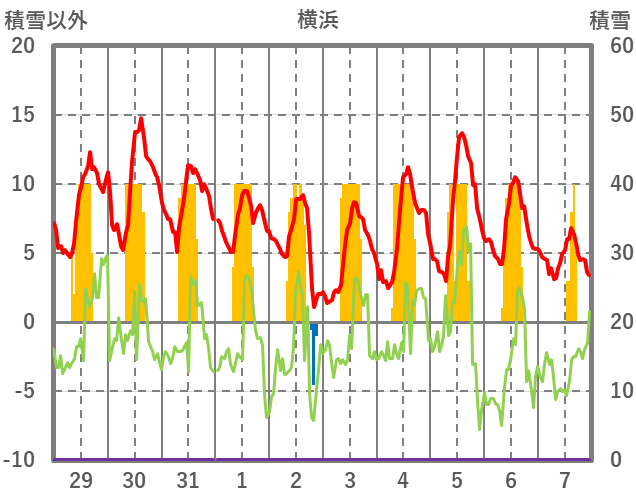 | 日 | 時 | 気温 | 降水 | 風向/風速 | 日照 | 積雪 | 降雪 |