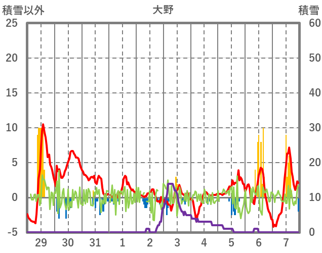 | 日 | 時 | 気温 | 降水 | 風向/風速 | 日照 | 積雪 | 降雪 |