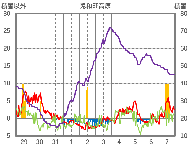 | 日 | 時 | 気温 | 降水 | 風向/風速 | 日照 | 積雪 | 降雪 |
