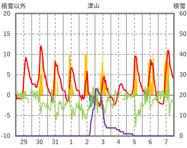 | 日 | 時 | 気温 | 降水 | 風向/風速 | 日照 | 積雪 | 降雪 |