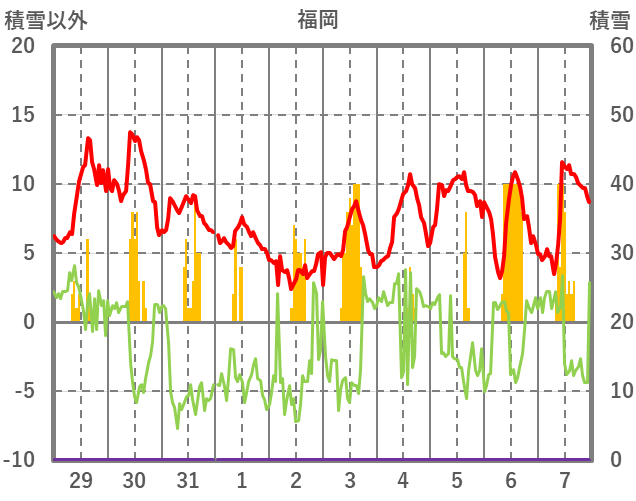 | 日 | 時 | 気温 | 降水 | 風向/風速 | 日照 | 積雪 | 降雪 |