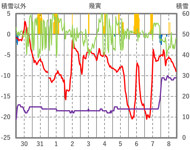 | 日 | 時 | 気温 | 降水 | 風向/風速 | 日照 | 積雪 | 降雪 |