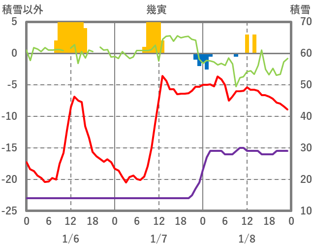 | 日 | 時 | 気温 | 降水 | 風向/風速 | 日照 | 積雪 | 降雪 |