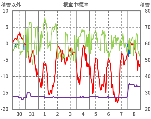 | 日 | 時 | 気温 | 降水 | 風向/風速 | 日照 | 積雪 | 降雪 |