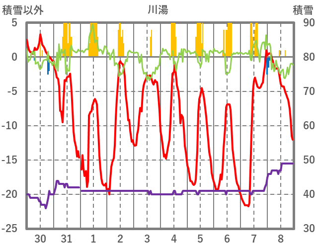 | 日 | 時 | 気温 | 降水 | 風向/風速 | 日照 | 積雪 | 降雪 |