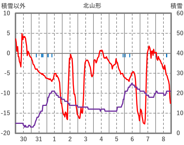 | 日 | 時 | 気温 | 降水 | 風向/風速 | 日照 | 積雪 | 降雪 |